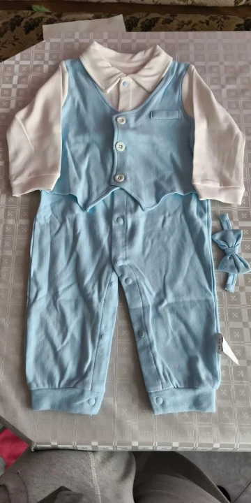 The garment is made from a soft, flexible fabric for comfort and ease of movement, presented in a baby blue color suitable for various occasions. It has a classic gentleman style with a smart collar and button-down front, along with snap openings for quick diaper changes. The elasticized cuffs and hips ensure a snug fit. The garment is well-stitched and can be paired with various items to create different looks, adding style, comfort, and utility to a baby's wardrobe.